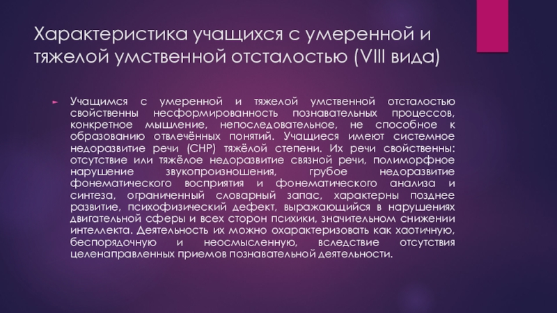 Слайд 5Характеристика учащихся с умеренной и тяжелой умственной отсталостью (VIII вида)