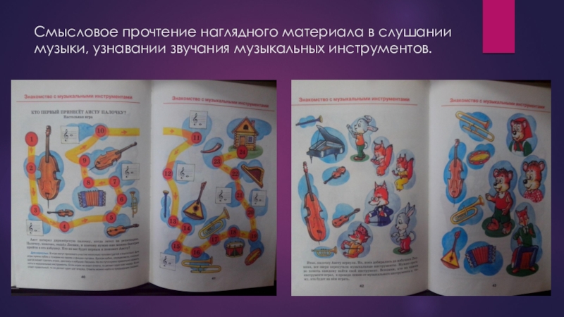 Слайд 20Смысловое прочтение наглядного материала в слушании музыки, узнавании звучания музыкальных инструментов.