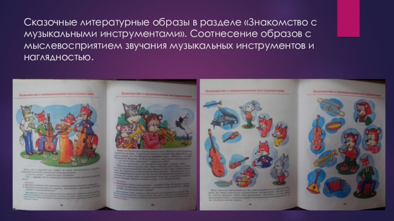 Слайд 8Сказочные литературные образы в разделе «Знакомство с музыкальными инструментами». Соотнесение образов