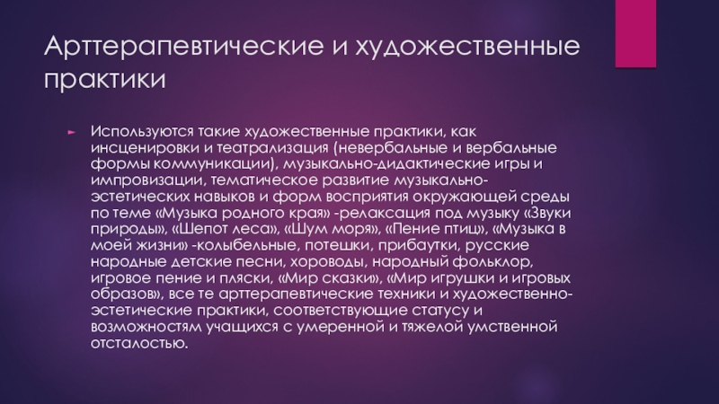 (невербальные и вербальные формы коммуникации), музыкально-дидактические игры и импровизации, тематическое развитие музыкально-эстетических навыков и форм восприятия окружающей среды по теме «Музыка родного края» -релаксация под музыку «Звуки природы», «Шепот леса», «Шум моря», «Пение птиц», «Музыка в моей жизни» -колыбельные, потешки, прибаутки, русские народные детские песни, хороводы, народный фольклор, игровое пение и пляски, «Мир сказки», «Мир игрушки и игровых образов», все те арттерапевтические техники и художественно-эстетические практики, соответствующие статусу и возможностям учащихся с умеренной и тяжелой умственной отсталостью.