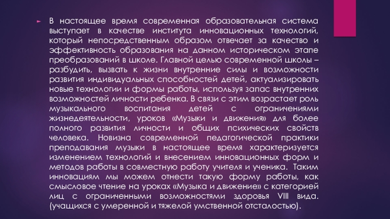 технологий, который непосредственным образом отвечает за качество и эффективность образования на данном историческом этапе преобразований в школе. Главной целью современной школы – разбудить, вызвать к жизни внутренние силы и возможности развития индивидуальных способностей детей, актуализировать новые технологии и формы работы, используя запас внутренних возможностей личности ребенка. В связи с этим возрастает роль музыкального воспитания детей с ограничениями жизнедеятельности, уроков «Музыки и движения» для более полного развития личности и общих психических свойств человека. Новизна современной педагогической практики преподавания музыки в настоящее время характеризуется изменением технологий и внесением инновационных форм и методов работы в совместную работу учителя и ученика. Таким инновациям мы можем отнести такую форму работы, как смысловое чтение на уроках «Музыка и движение» с категорией лиц с ограниченными возможностями здоровья VIII вида. (учащихся с умеренной и тяжелой умственной отсталостью).