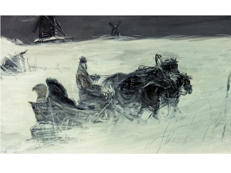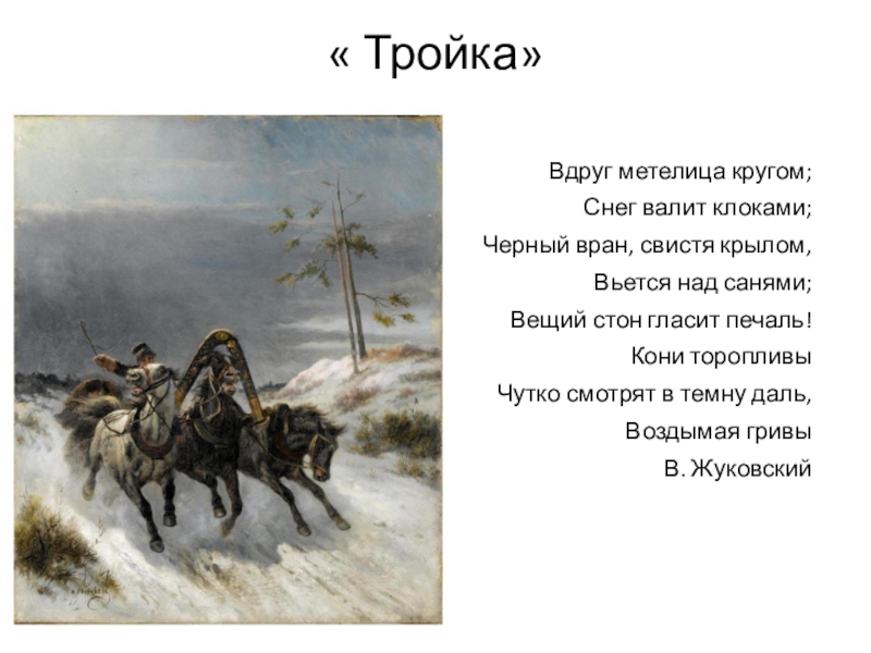 « Тройка» Вдруг метелица кругом;Снег валит клоками;Черный вран, свистя крылом, Вьется над санями;Вещий стон гласит печаль!Кони торопливыЧутко