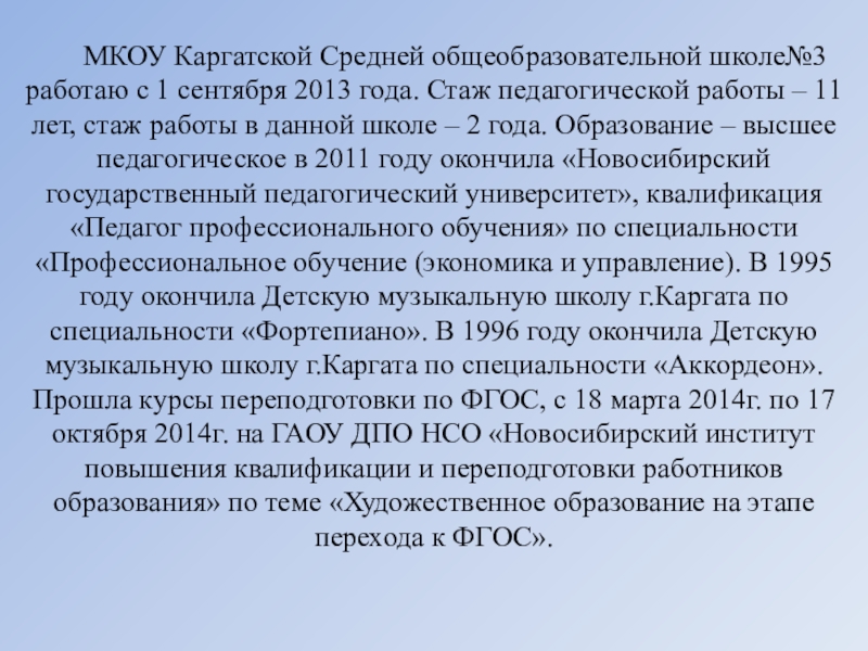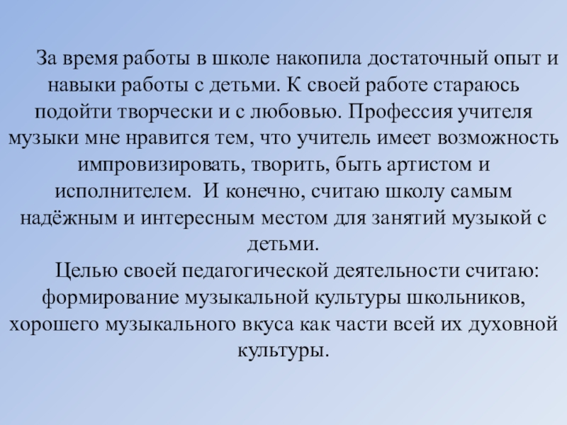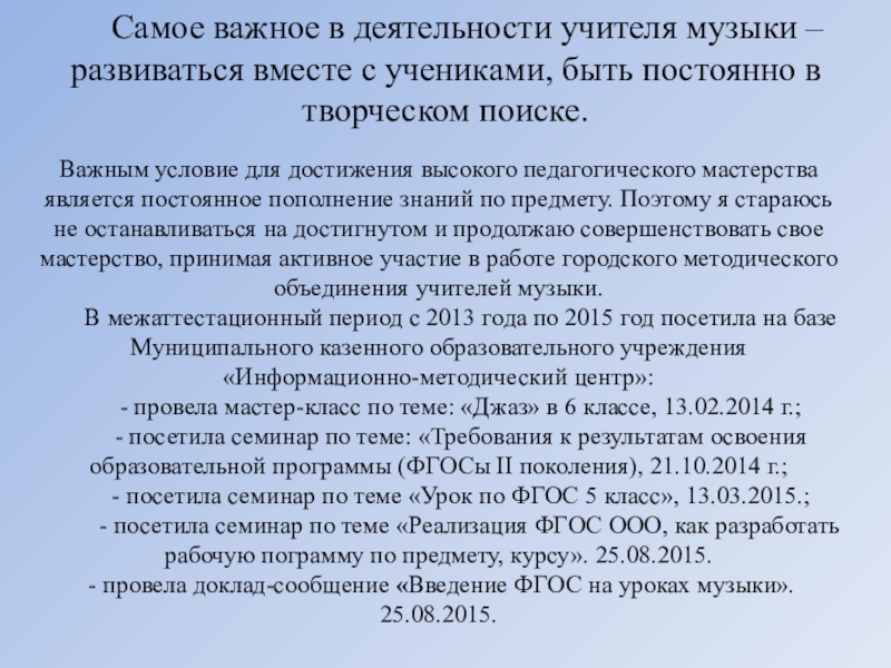 Важным условие для достижения высокого педагогического мастерства является постоянное пополнение знаний по предмету. Поэтому я стараюсь не останавливаться на достигнутом и продолжаю совершенствовать свое мастерство, принимая активное участие в работе городского методического объединения учителей музыки.