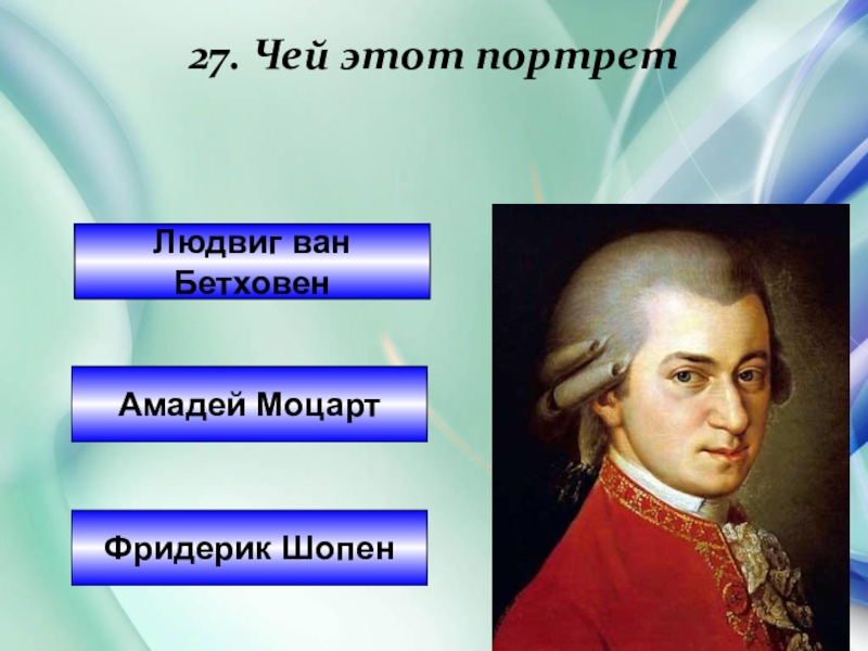 Людвиг ван БетховенАмадей МоцартФридерик Шопен27. Чей этот портрет