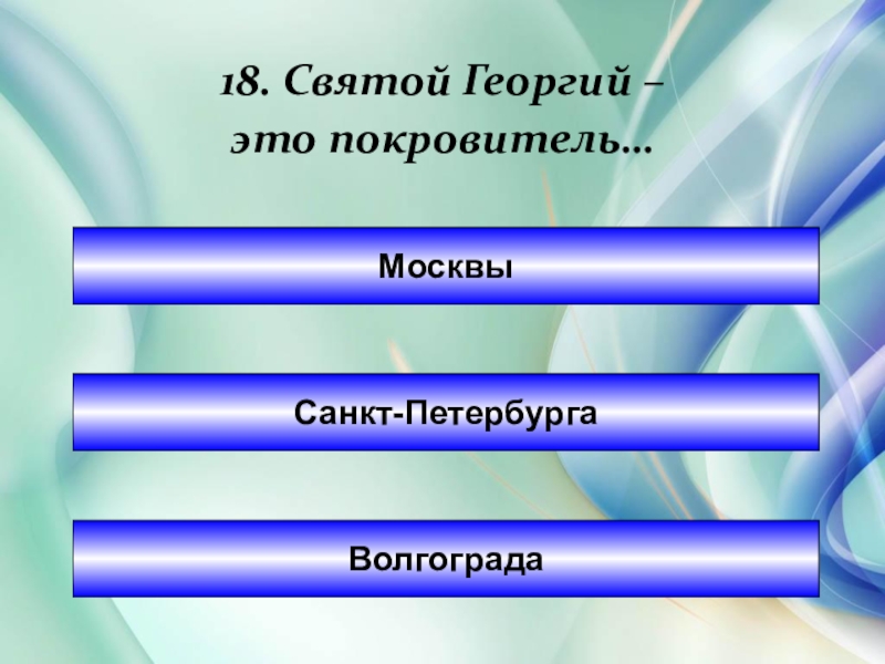 МосквыСанкт-ПетербургаВолгограда18. Святой Георгий – это покровитель…