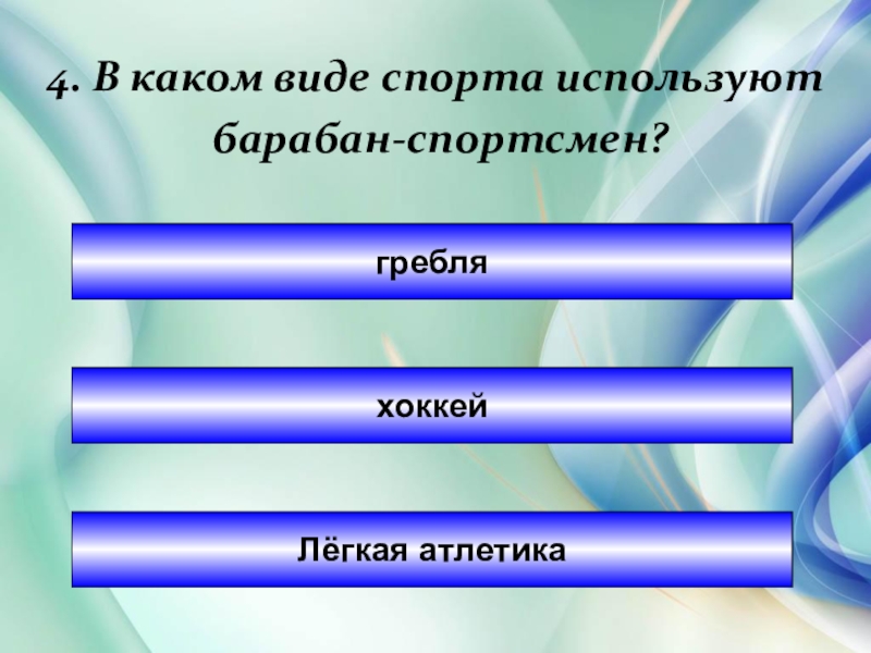 гребляхоккейЛёгкая атлетика4. В каком виде спорта используют барабан-спортсмен?