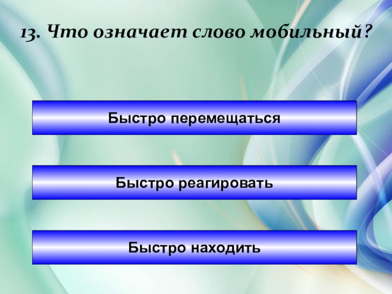 13. Что означает слово мобильный? Быстро перемещатьсяБыстро реагироватьБыстро находить
