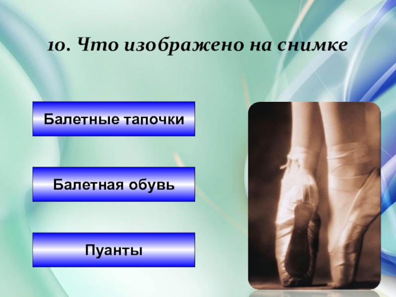 Балетные тапочкиБалетная обувьПуанты10. Что изображено на снимке