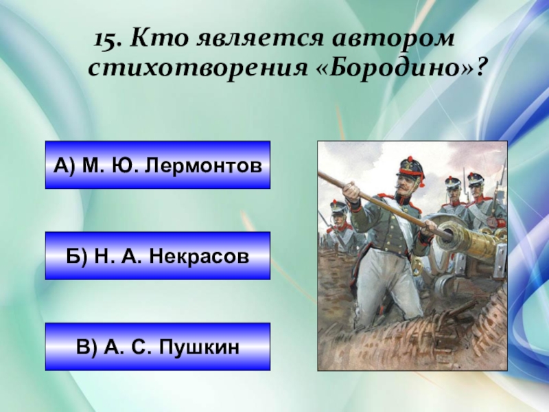 15. Кто является автором стихотворения «Бородино»? А) М. Ю. ЛермонтовБ) Н. А. НекрасовВ) А. С. Пушкин
