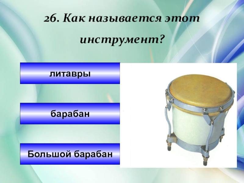 26. Как называется этотинструмент? литаврыбарабанБольшой барабан