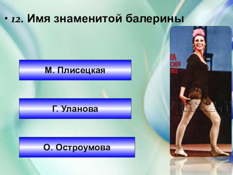 12. Имя знаменитой балериныМ. ПлисецкаяГ. УлановаО. Остроумова