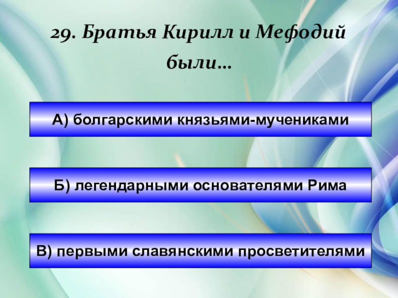 29. Братья Кирилл и Мефодий были…А) болгарскими князьями-мученикамиБ) легендарными основателями РимаВ) первыми славянскими просветителями