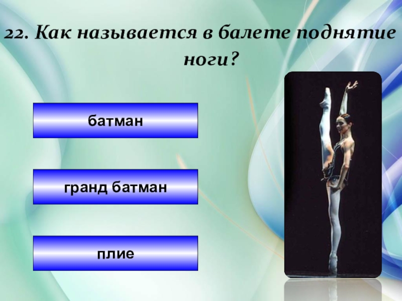 22. Как называется в балете поднятие ноги? батмангранд батманплие