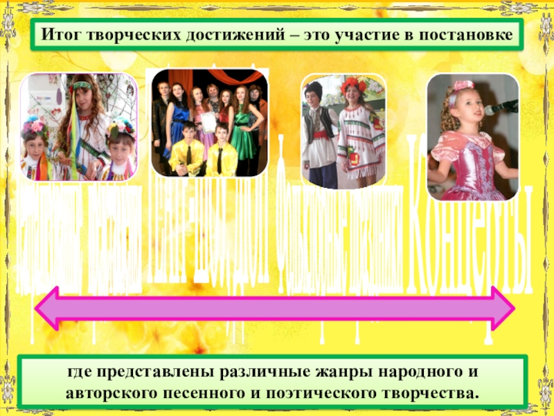 Итог творческих достижений – это участие в постановке где представлены различные жанры народного и авторского песенного и