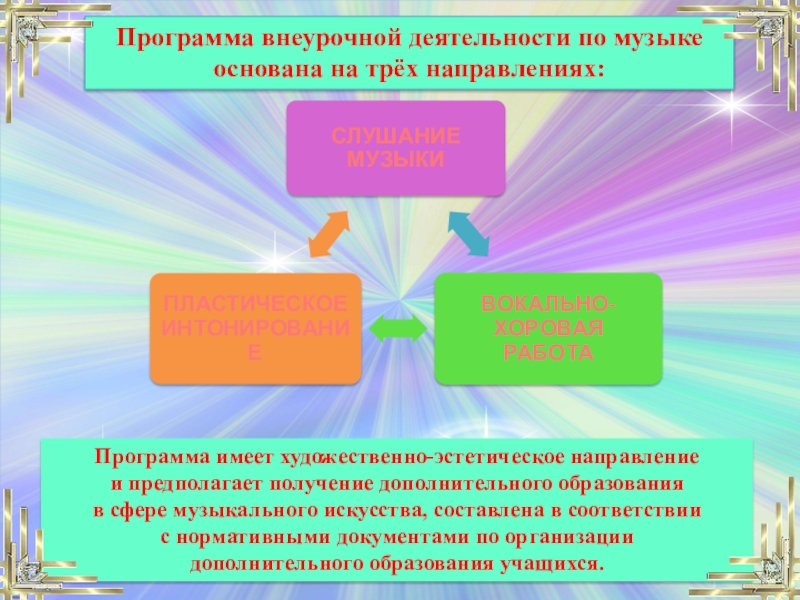 Программа внеурочной деятельности по музыке основана на трёх направлениях: Программа имеет художественно-эстетическое направление и предполагает получение дополнительного