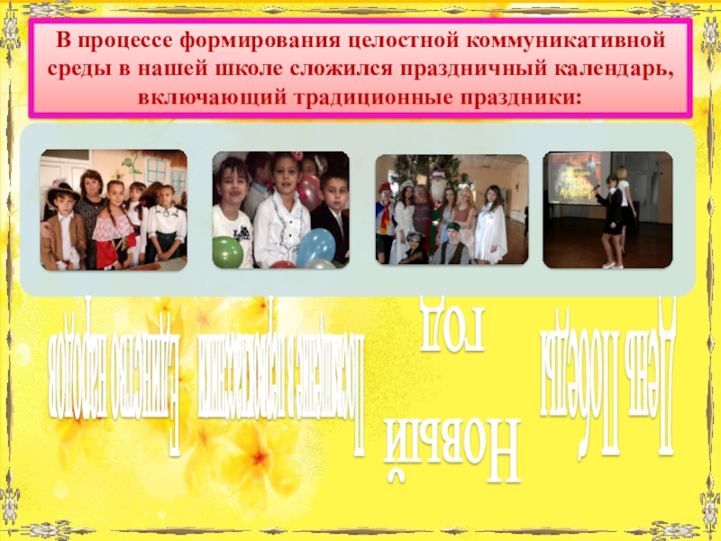 В процессе формирования целостной коммуникативной среды в нашей школе сложился праздничный календарь, включающий традиционные праздники: