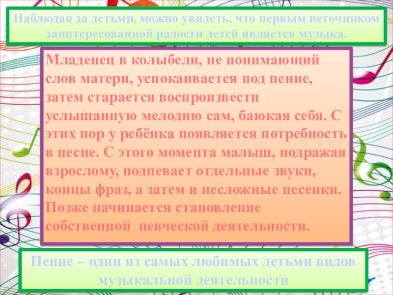 старается воспроизвести услышанную мелодию сам, баюкая себя. С этих пор у ребёнка появляется потребность в песне. С этого момента малыш, подражая взрослому, подпевает отдельные звуки, концы фраз, а затем и несложные песенки. Позже начинается становление собственной певческой деятельности.