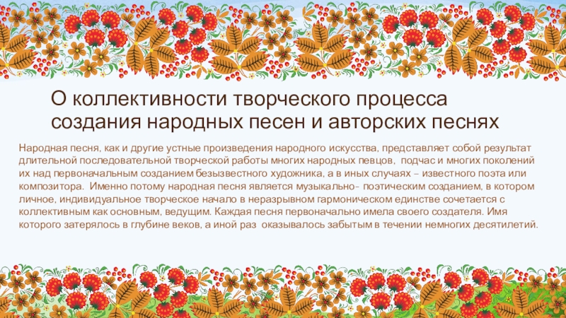 Слайд 7О коллективности творческого процесса создания народных песен и авторских песнях