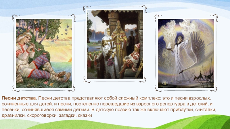 Слайд 9Песни детства. Песни детства представляют собой сложный комплекс: это и песни