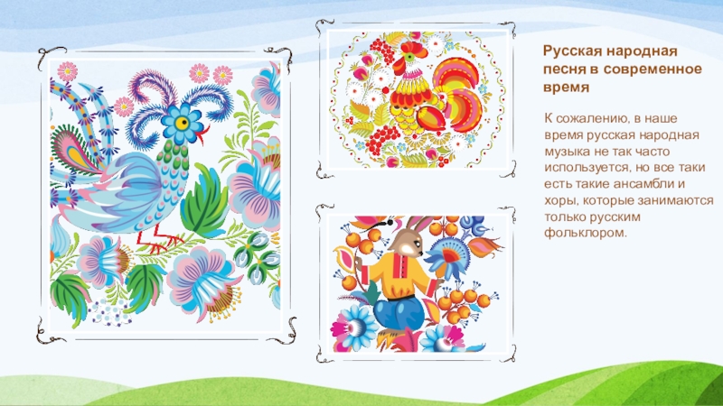 народная музыка не так часто используется, но все таки есть такие ансамбли и хоры, которые занимаются только русским фольклором.