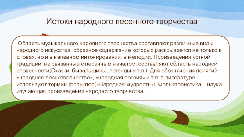 народного искусства, образное содержание которых раскрывается не только в словах, но и в напевном интонировании, в мелодии. Произведения устной традиции, не связанные с песенным началом, составляют область народной словесности(Сказки, бывальщины, легенды и т.п.). Для обозначения понятий «народное песнетворчество», «народная поэзия» и т.п. в литературе используют термин фольклор(«Народная мудрость»). Фольклористика – наука изучающая произведения народного творчества.