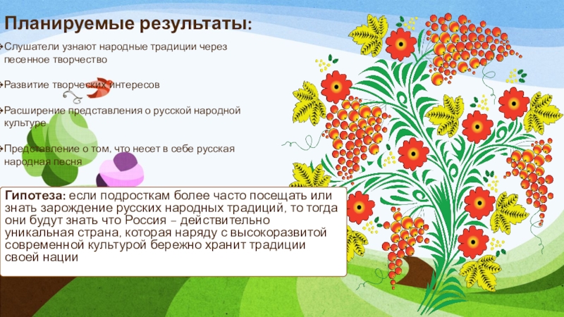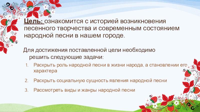 Слайд 3Цель: ознакомится с историей возникновения песенного творчества и современным состоянием народной
