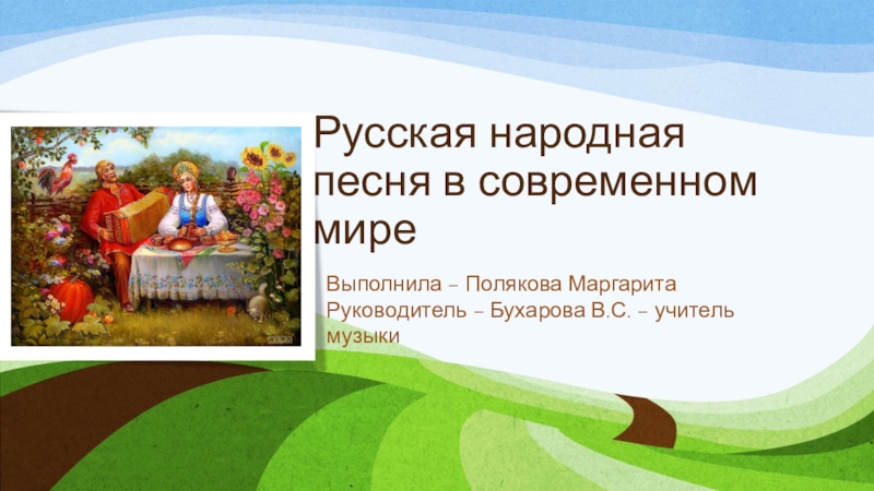 ценность. В создание и развитие народных песен вложило свою фантазию не одно русское поколение. Каждая историческая эпоха, каждая социальная группа влияла на логику построения народной песни, отражались на ее стилистических особенностях, создавали свои определенные музыкальные формы.