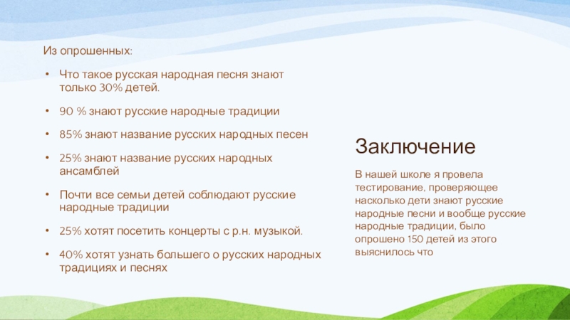 народные песни и вообще русские народные традиции, было опрошено 150 детей из этого выяснилось что