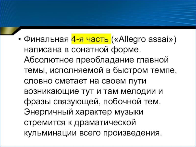 Слайд 14Финальная 4-я часть («Allegro assai») написана в сонатной форме. Абсолютное преобладание
