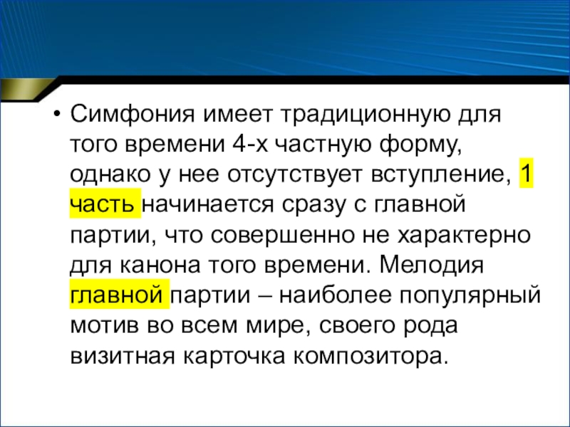 нее отсутствует вступление, 1 часть начинается сразу с главной партии, что совершенно не характерно для канона того времени. Мелодия главной партии – наиболее популярный мотив во всем мире, своего рода визитная карточка композитора.