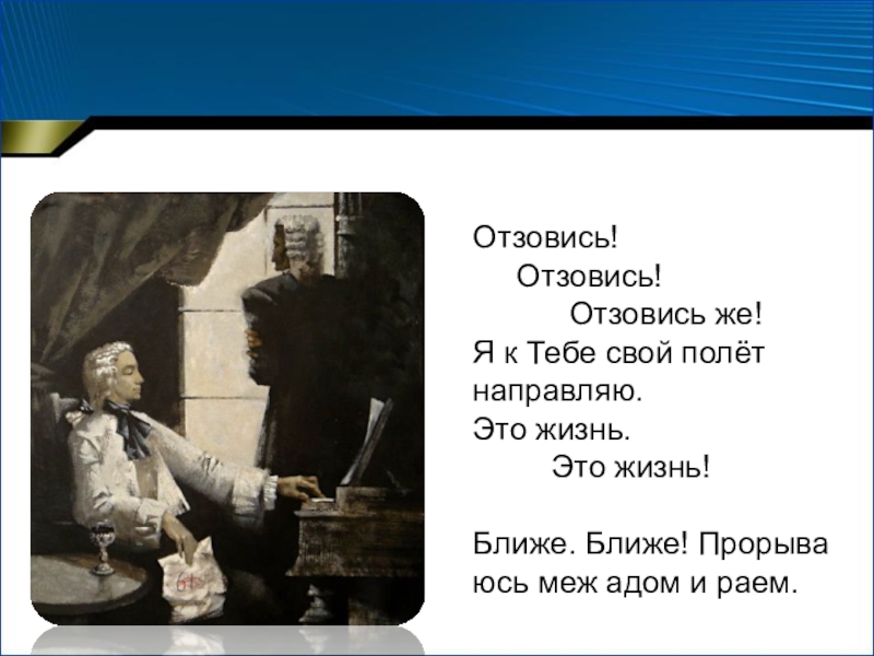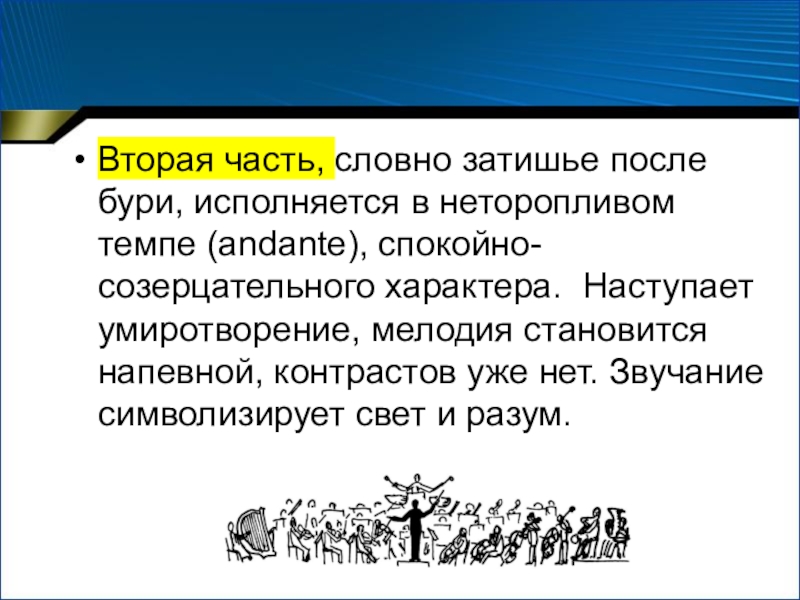Слайд 12Вторая часть, словно затишье после бури, исполняется в неторопливом темпе (andante),