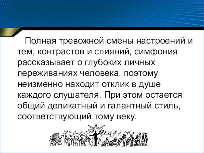 Слайд 10 Полная тревожной смены настроений и тем, контрастов и слияний, симфония