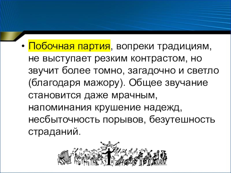 Слайд 11Побочная партия, вопреки традициям, не выступает резким контрастом, но звучит более