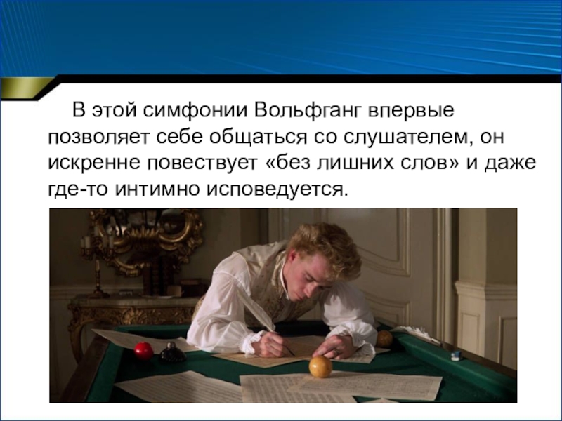 Слайд 8 В этой симфонии Вольфганг впервые позволяет себе общаться со