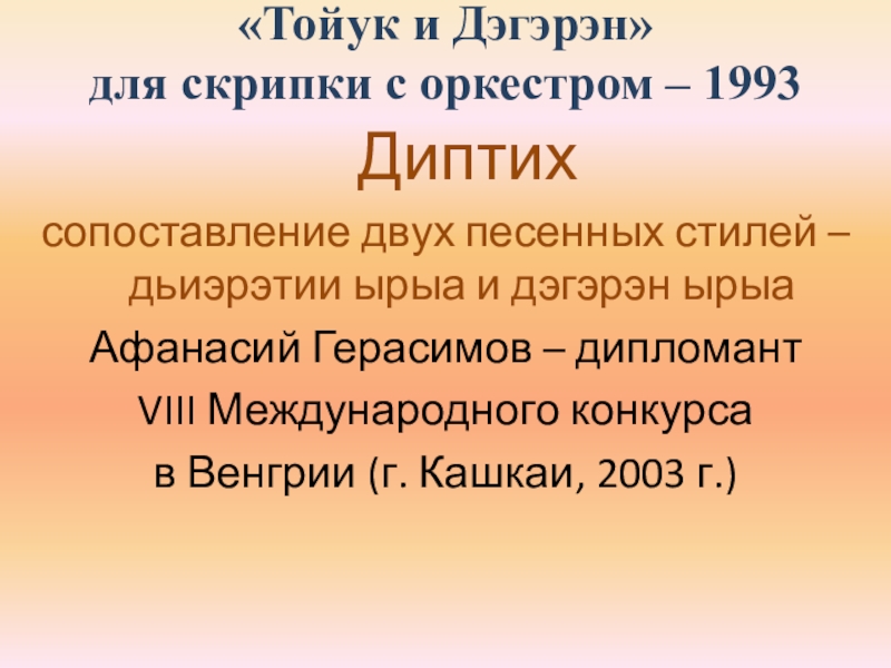«Тойук и Дэгэрэн» для скрипки с оркестром, 1993 г.;