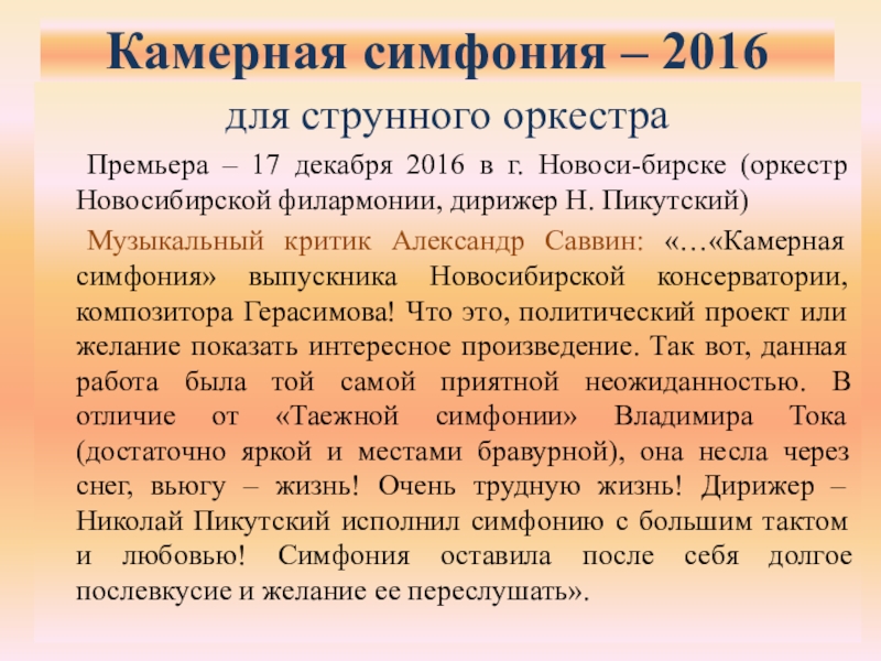 Музыкальный критик Александр Саввин: «…«Камерная симфония» выпускника Новосибирской консерватории, композитора Герасимова! Что это, политический проект или желание показать интересное произведение. Так вот, данная работа была той самой приятной неожиданностью. В отличие от «Таежной симфонии» Владимира Тока (достаточно яркой и местами бравурной), она несла через снег, вьюгу – жизнь! Очень трудную жизнь! Дирижер – Николай Пикутский исполнил симфонию с большим тактом и любовью! Симфония оставила после себя долгое послевкусие и желание ее переслушать».