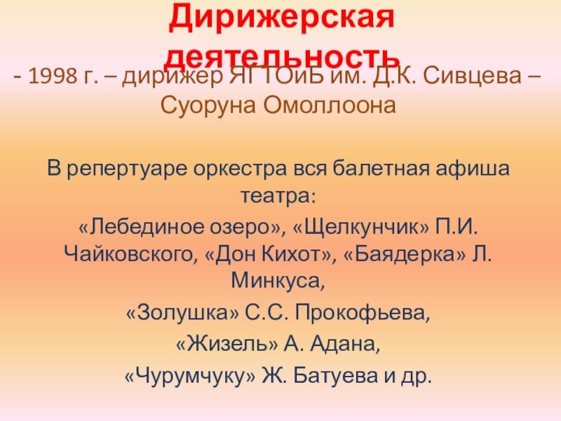 1998 г. – дирижер ЯГТОиБ им. Д.К. Сивцева –