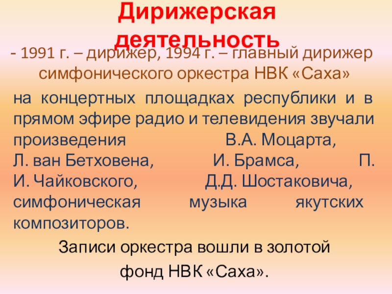 на концертных площадках республики и в прямом эфире радио и телевидения звучали произведения В.А. Моцарта, Л. ван Бетховена, И. Брамса, П.И. Чайковского, Д.Д. Шостаковича, симфоническая музыка якутских композиторов.