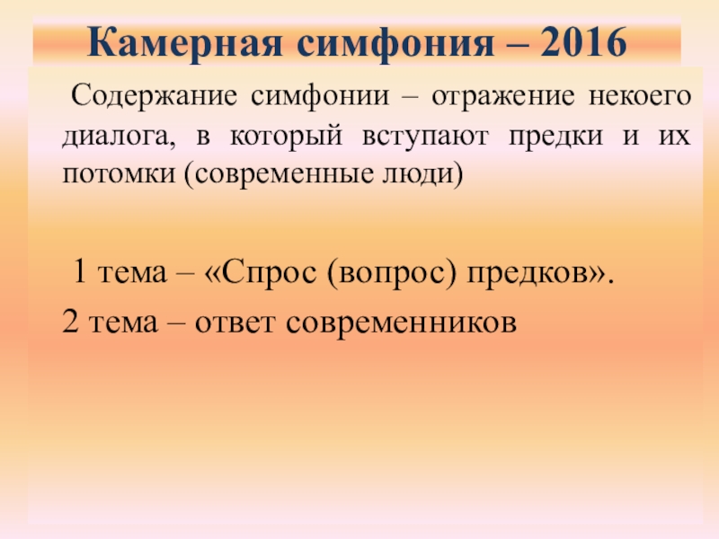 В одночастной симфонии заложена глубокая тема отношений молодежи к традициям предков, к природе, окружающему миру, а тажке к моральным ценностям