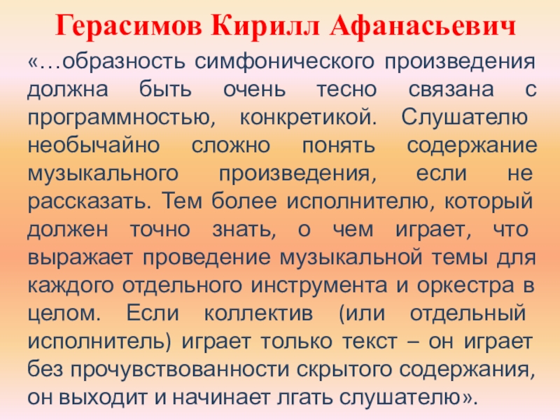 программностью, конкретикой. Слушателю необычайно сложно понять содержание музыкального произведения, если не рассказать. Тем более исполнителю, который должен точно знать, о чем играет, что выражает проведение музыкальной темы для каждого отдельного инструмента и оркестра в целом. Если коллектив (или отдельный исполнитель) играет только текст – он играет без прочувствованности скрытого содержания, он выходит и начинает лгать слушателю».