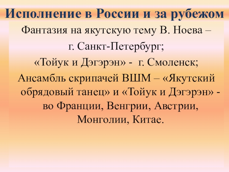 Ансамбль скрипачей ВШМ – «Якутский обрядовый танец» и «Тойук и Дэгэрэн» - во Франции, Венгрии, Австрии, Монголии, Китае.