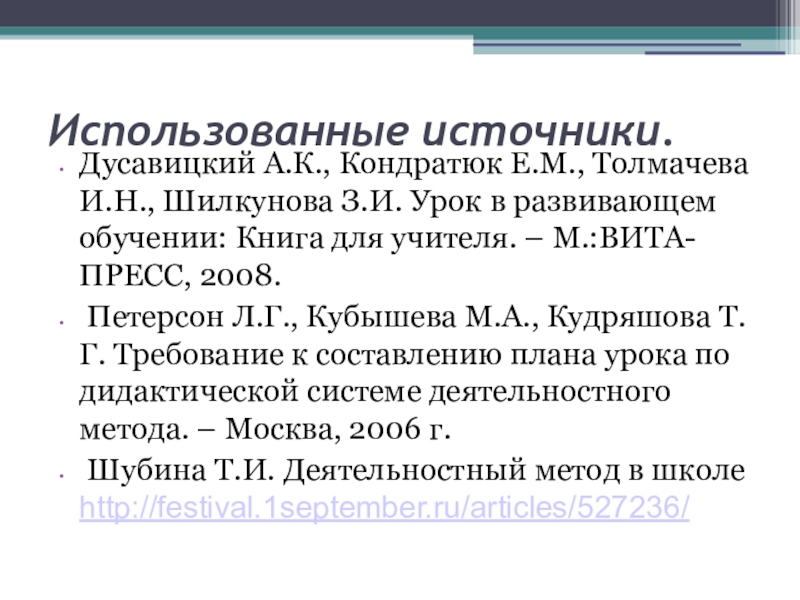 Петерсон Л.Г., Кубышева М.А., Кудряшова Т.Г. Требование к составлению плана урока по дидактической системе деятельностного метода. – Москва, 2006 г.
