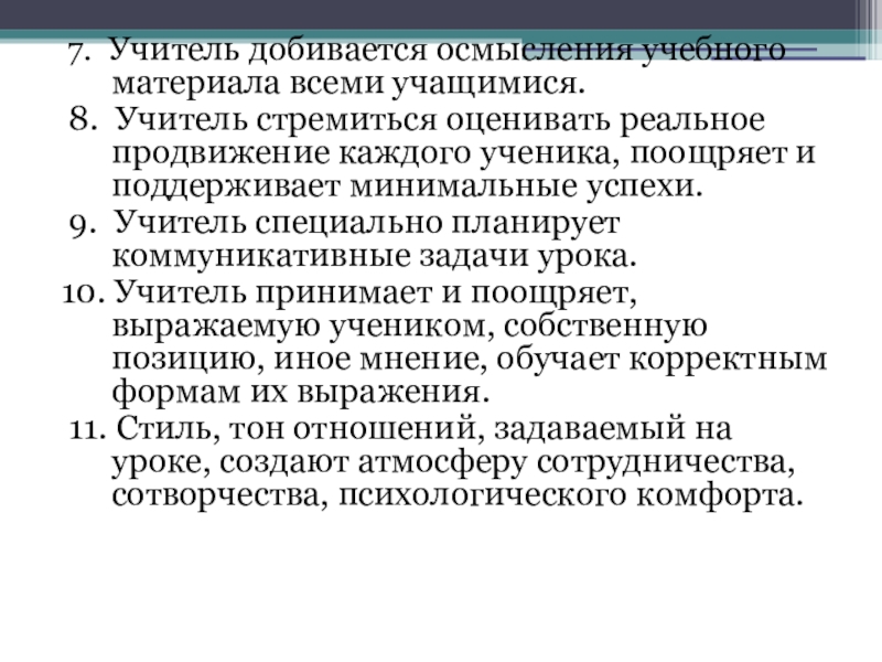 11. Стиль, тон отношений, задаваемый на уроке, создают атмосферу сотрудничества, сотворчества, психологического комфорта.
