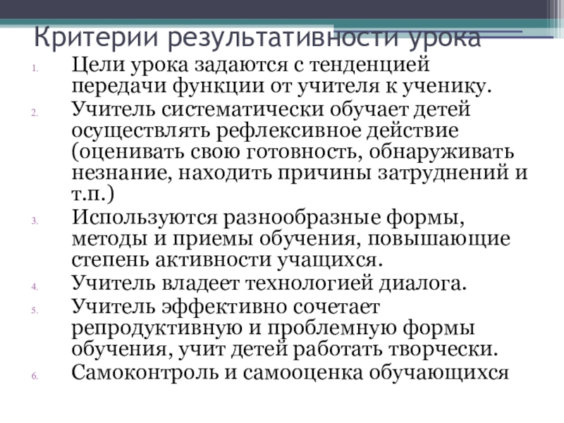 Учитель систематически обучает детей осуществлять рефлексивное действие (оценивать свою готовность, обнаруживать незнание, находить причины затруднений и т.п.)