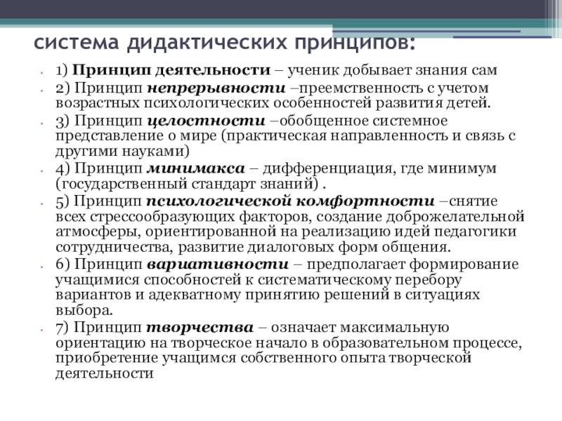 6) Принцип вариативности – предполагает формирование учащимися способностей к систематическому перебору вариантов и адекватному принятию решений в ситуациях выбора.
