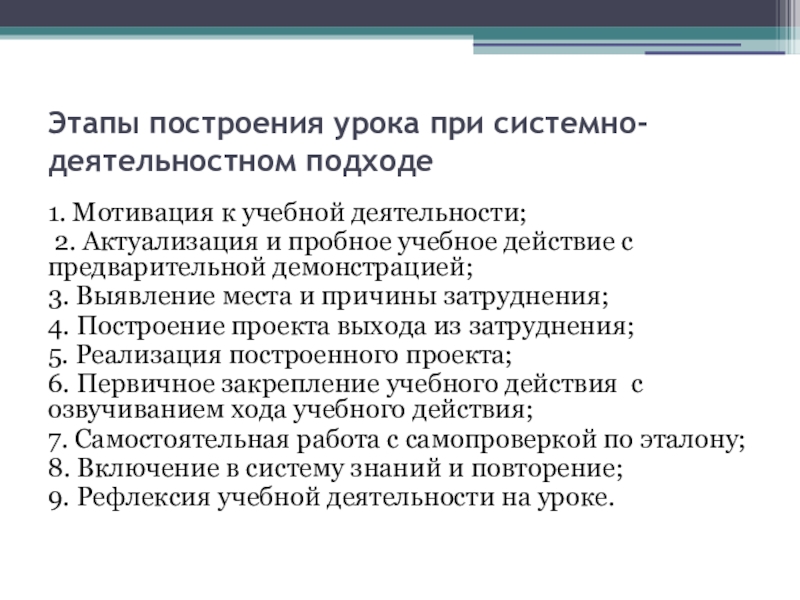 Слайд 6Этапы построения урока при системно-деятельностном подходе