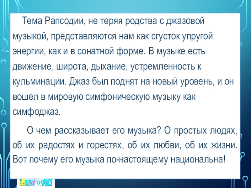 Слайд 11 Тема Рапсодии, не теряя родства с джазовой музыкой, представляются