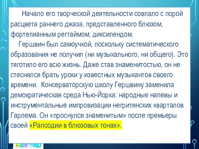 Гершвин был самоучкой, поскольку систематического образования не получил (ни музыкального, ни общего). Это тяготило его всю жизнь. Даже став знаменитостью, он не стеснялся брать уроки у известных музыкантов своего времени. Консерваторскую школу Гершвину заменила демократическая среда Нью-Йорка: народные напевы и инструментальные импровизации негритянских кварталов Гарлема. Он «проснулся знаменитым» после премьеры своей «Рапсодии в блюзовых тонах».