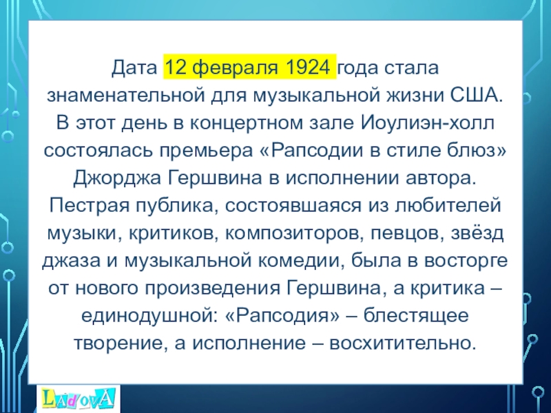 В этот день в концертном зале Иоулиэн-холл состоялась премьера «Рапсодии в стиле блюз» Джорджа Гершвина в исполнении автора. Пестрая публика, состоявшаяся из любителей музыки, критиков, композиторов, певцов, звёзд джаза и музыкальной комедии, была в восторге от нового произведения Гершвина, а критика – единодушной: «Рапсодия» – блестящее творение, а исполнение – восхитительно.
