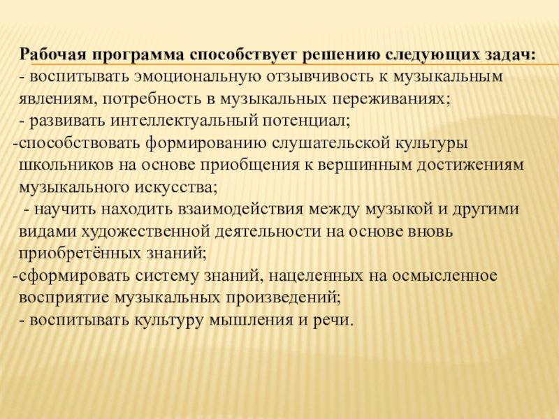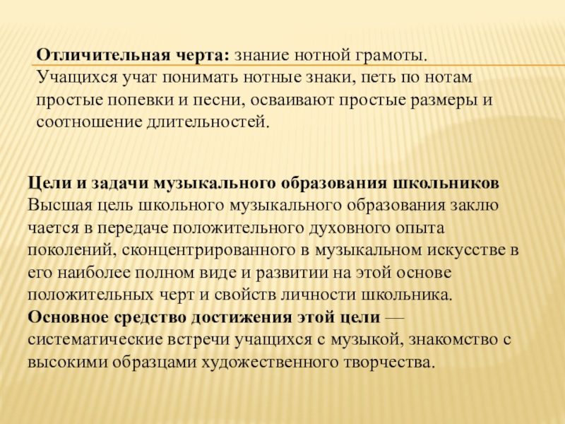 Высшая цель школьного музыкального образования заключается в передаче положительного духовного опыта поколений, сконцентрированного в музыкальном искусстве в его наиболее полном виде и развитии на этой основе положительных черт и свойств личности школьника.